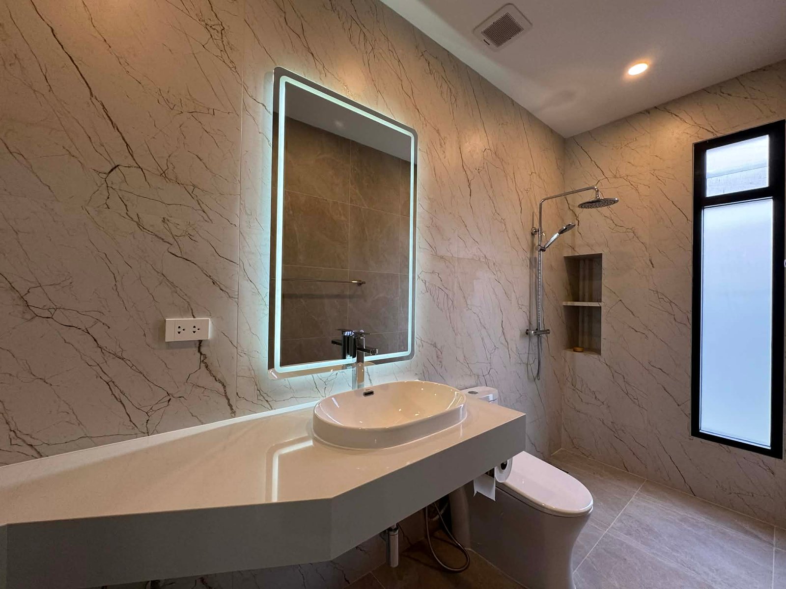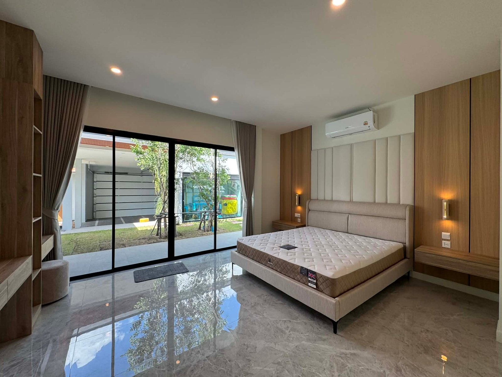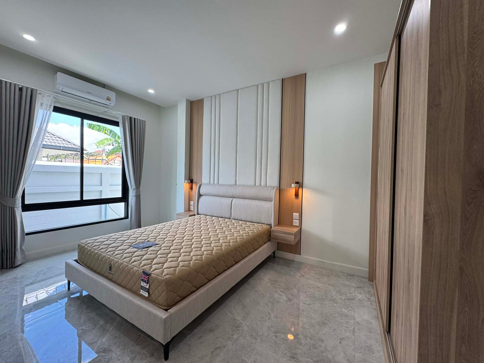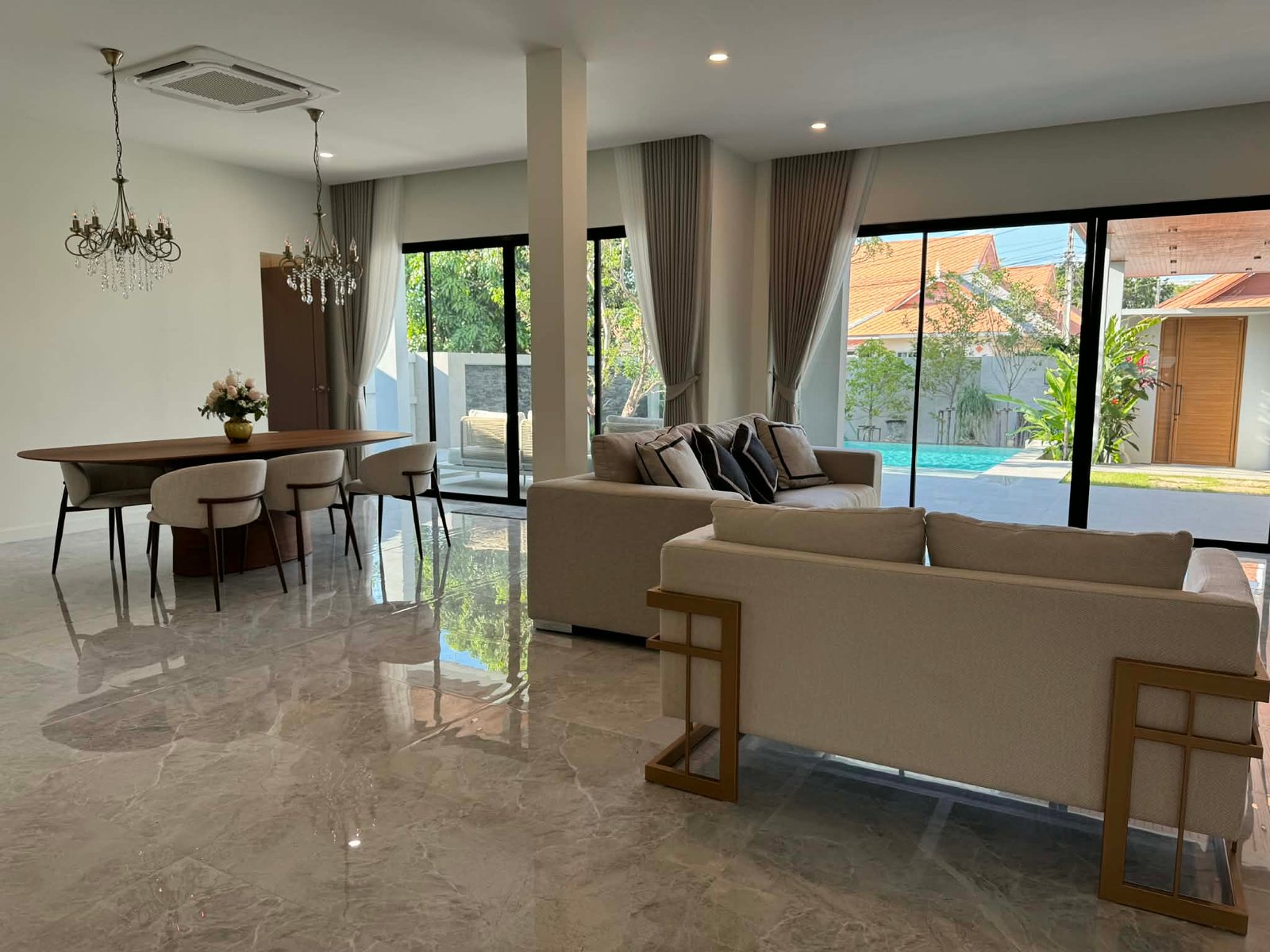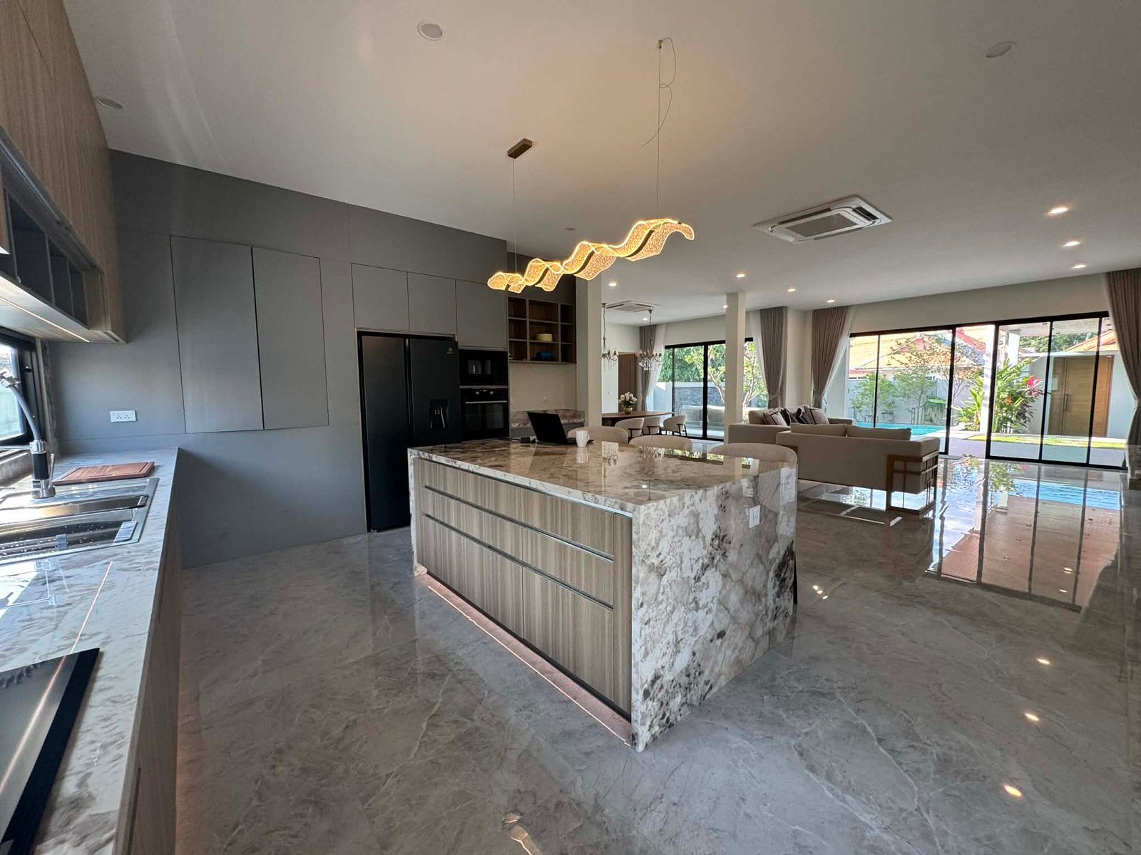 The large, covered outdoor terras which is near half the size of the inner living area, is seamlessly connected with the pool and has a ceiling height of 3,2m to enhance air circulation without direct sunlight at daytime, and gives at night this extra breeze of cool air from the pool and waterfall surface. Pool itself is built to perfection, with Jacuzzi and splash deck, recessed edge and full width waterfall, seldom seen in Thailand. Terras, carport and all bathrooms are paved with anti-slip porcelain tiles for your wellbeing and safety. The villa has a large open plan kitchen, which includes all high-end build-in fittings; double tap sink, dishwasher, rectangle ceramic hob w/ multiple cooking zones, hood, microwave, oven and a standalone 2 door fridge. The kitchen area features a comfortable breakfast island with 3 chairs, a pantry and multiple drawers and cabinets for storage. Via the kitchen area backdoor, a separate outdoor kitchen with gas stove and sink can be accessed for preparing specialty dishes. Living and dining area both have oversized sliding doors in height and width for natural light, and facing towards the terras and pool, to enhance the multifunctional idea of outdoor living. But also utilizes 2 powerful ceiling air-conditioning units for indoor living if needed. All 3 Bedrooms have built-in furniture, air-conditioning, beds with high grade mattresses and ensuite bathrooms with temperature shower mixers, and hot water at each sink tap. The carport features an automatic overhead shutter, a multifunctional washroom, large enough to store garden equipment next to a washing machine/dryer, and as a preference the property comes with 3 Phase electric, to utilize future electric enhancements like solar. Location wise, the property is situated in a 24 hour secured community called “Baan Suan Neramit” which translates to “House in the Garden of Neramit”. Must been seen to appreciate. For Viewing call: 0940023989 |