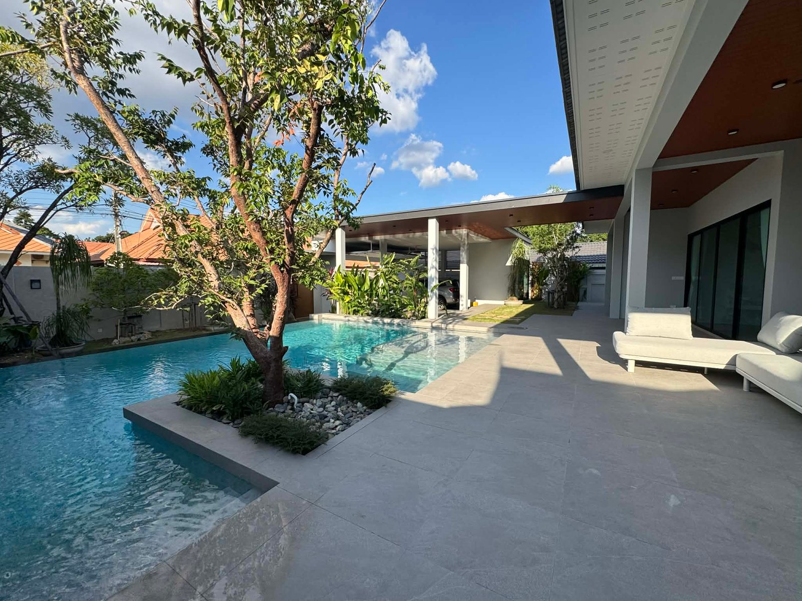 | For Sale by Owner True outdoor living in Simple Luxury. A new pool villa created with four focal points in mind; outdoor living, shade, nature and refreshment. Finished on a 552 sqm plot, this new single-story villa with a modern touch features a private pool, a carport fit for ample parking of 2 cars, and a full covered entry walkway towards the living room. The villa and pool are slightly elevated, to give this extra touch of a fresh top of the hill atmosphere towards surrounding garden, trees and plants.